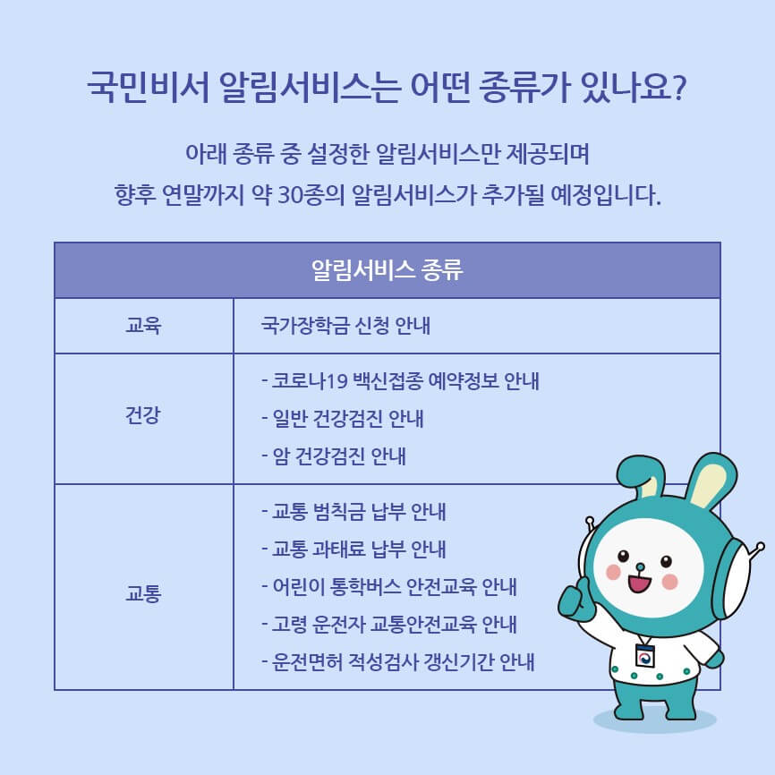 아래의 종류 중 설정한 알림서비스만 제공되며, 향후 연말까지 약 30종의 알림서비스가 추가될 예정입니다.