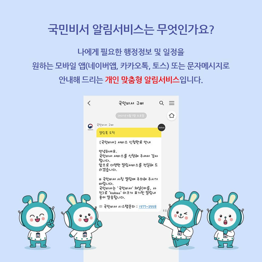 나에게 필요한 행정정보 및 일정을 원하는 모바일 앱(네이버앱, 카카오톡, 토스) 또는 문자메시지로 안내해 드리는 개인 맞춤형 알림서비스입니다.