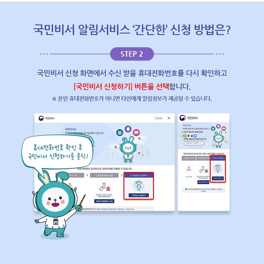 [STEP 2] 국민비서 신청 화면에서 수신 받을 휴대전화번호를 다시 확인하고 [국민비서 신청하기] 버튼을 선택합니다.